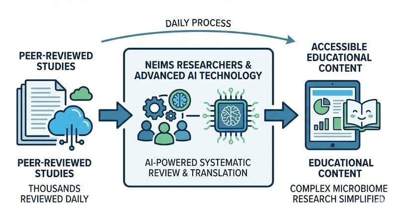 NEIMS is driven by a team of researchers who use advanced Al technology to systematically review thousands of peer-reviewed studies daily, translating complex microbiome research into accessible educational content.