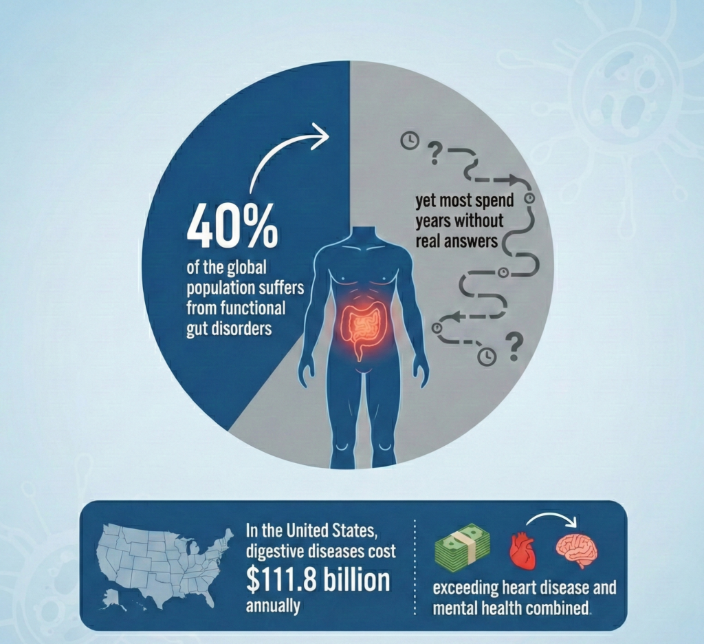 40% of the global population suffers from functional gut disorders, yet most spend years without real answers (Gastroenterology, 2024).